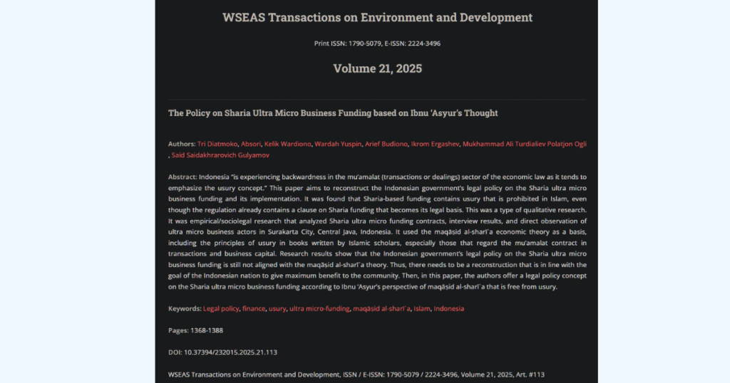 Prof. Said Gulyamov published article “The Policy on Sharia Ultra Micro Business Funding based on Ibnu ‘Asyur’s Thought”